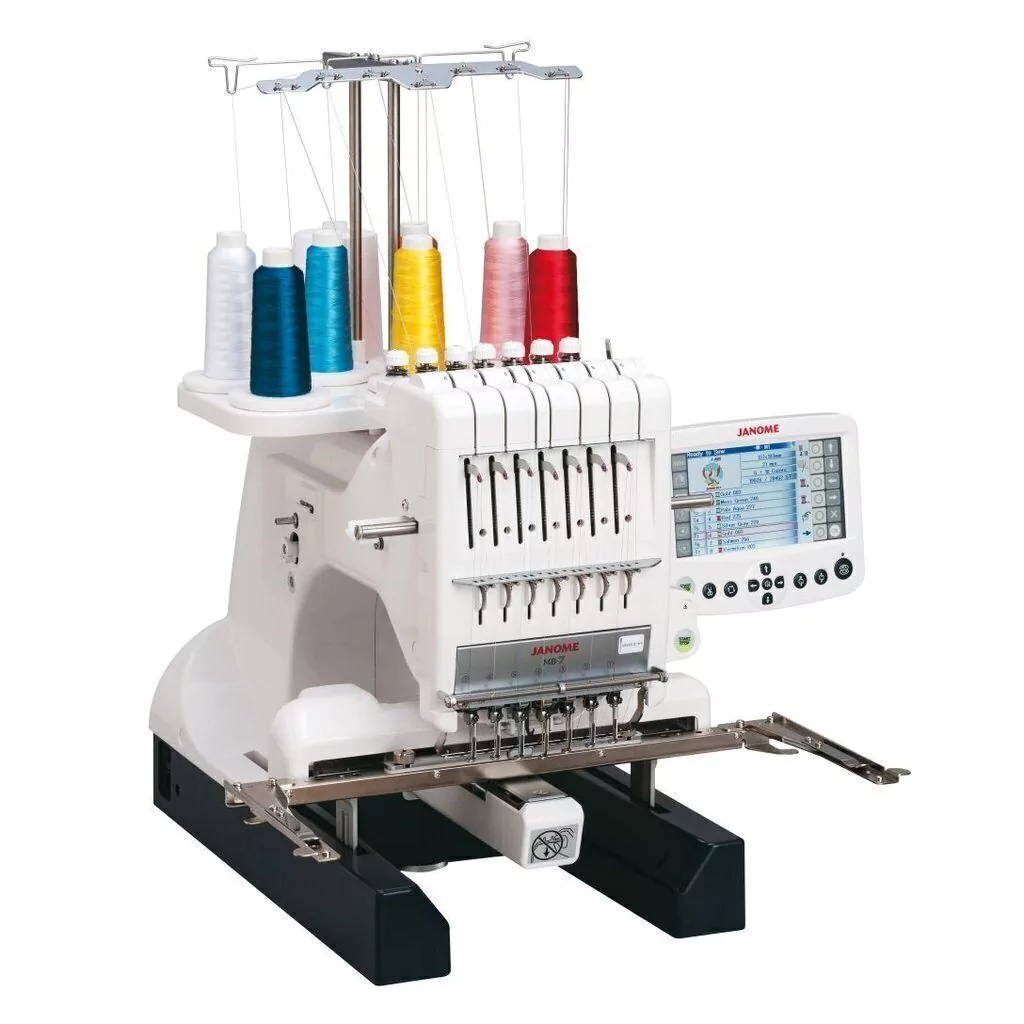 La Janome MB7 está fabricada y diseñada en Japón. Cuenta con 1 cabezal y 7 agujas, lo que representa 7 cambios de hilo automático. Su velocidad máxima es de 800 PPM y su área de bordado de 240 x 200 mm. También posee 50 diseños de bordados incorporados y 10 fuentes para monogramas.